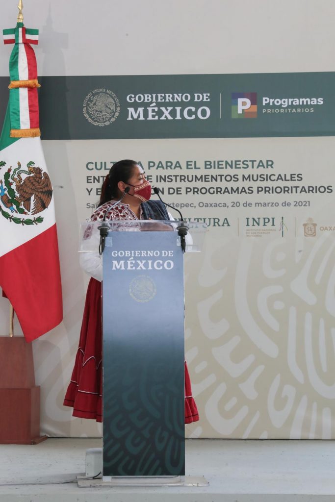 Leticia Gallardo Martinez, Directora de la Banda Filarmónica Regional Mujeres del «Viento Florido», en representación de los beneficiarios recibió los instrumentos, quien en su intervención agradeció el apoyo presidencial para fortalecer la cultura musical de Oaxaca, además de proponerle un apoyo especial para los maestros comunitarios que están fomentando ésta expresión musical.