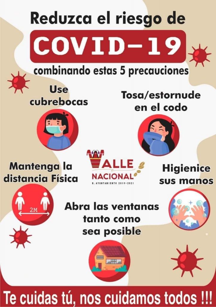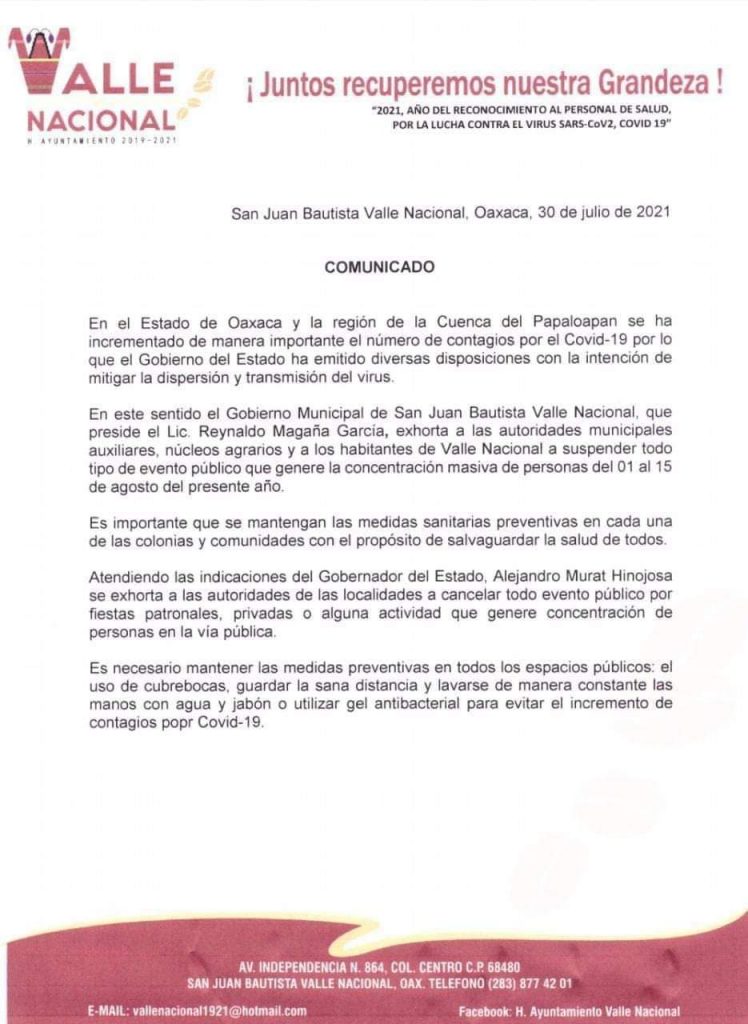 El gobierno municipal, exhorta a las autoridades municipales, auxiliares, núcleos agrarios y a los habitantes de Valle Nacional a suspender todo tipo de evento público que genere la concentración masiva de personas del 1 al 15 de agosto de 2021.