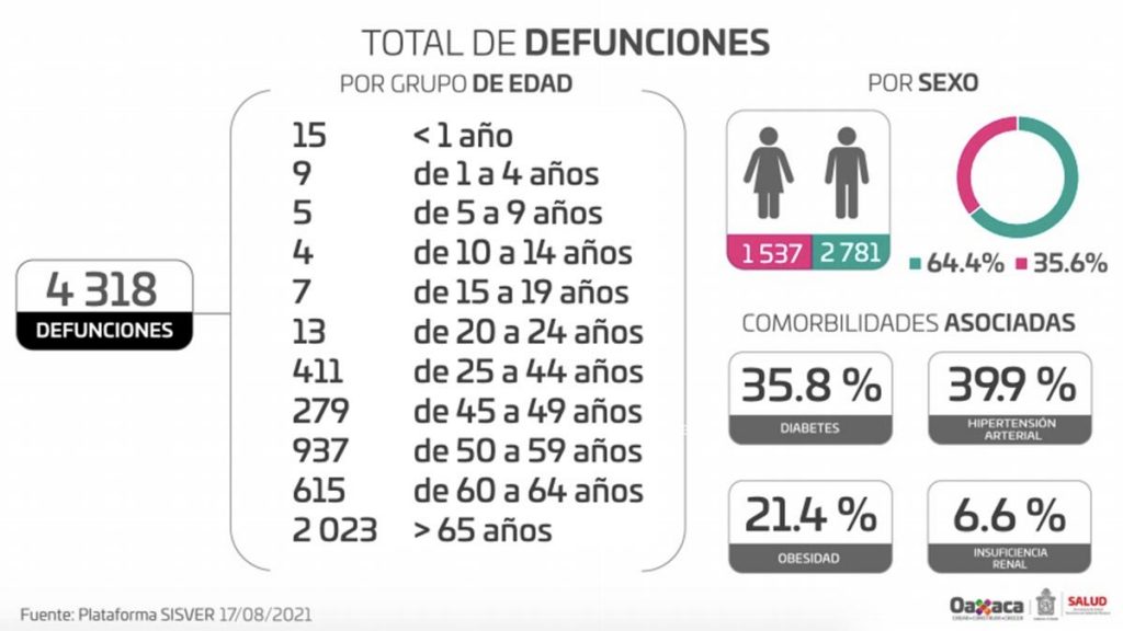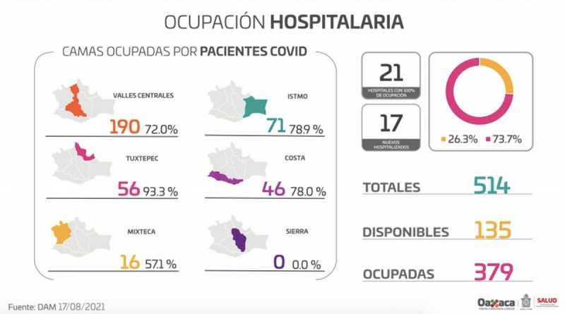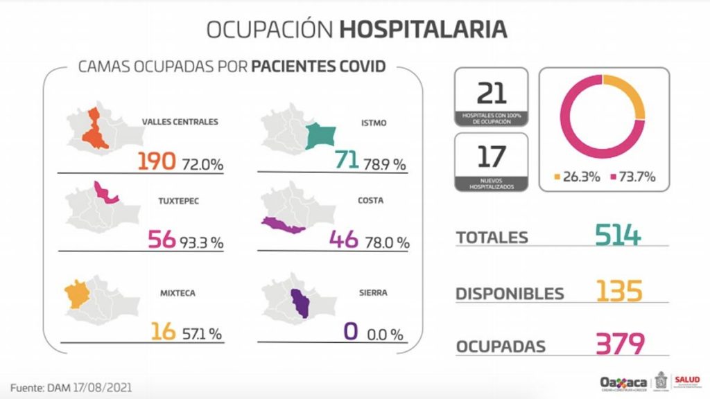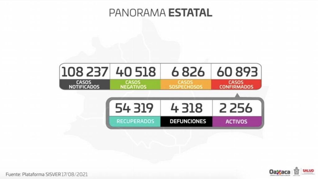 OAXACA, Oax. 17 de agosto de 2021.- Oaxaca sumó este martes 19 decesos y 2,256 contagios por Covid.