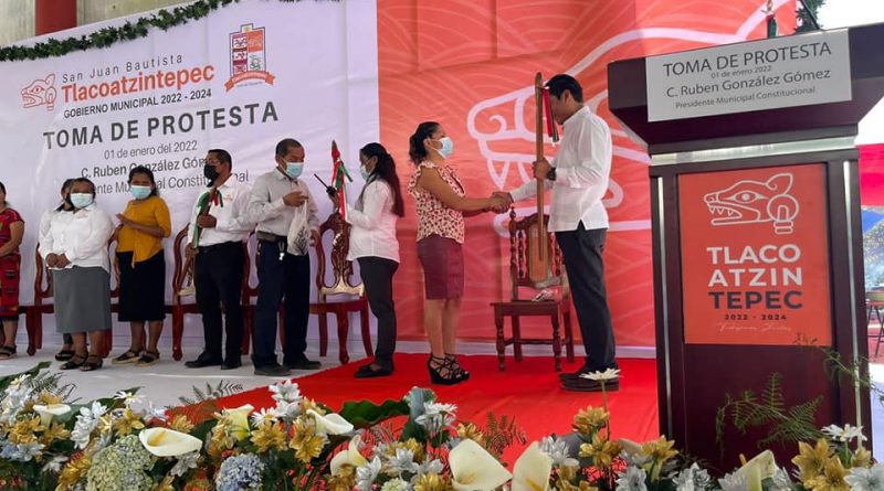 SAN JUAN BAUTISTA TLACOATZINTEPEC, OAXACA.- EL Presidente Municipal Constitucional, Rubén González Gómez, al tomar protesta de ley con los integrantes de su cabildo, propuso a conducir un gobierno renovado cercano a la gente, transparente y con determinación para promover el desarrollo de su municipio.