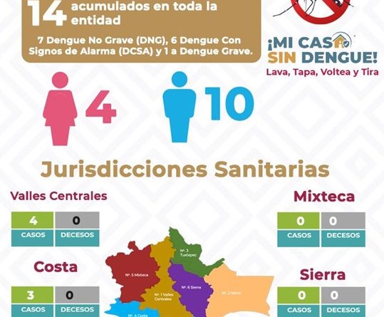 En la semana epidemiológica número 11 del presente año, se registraron dos casos nuevos, que suman 14 en el territorio oaxaqueño, con la circulación de los serotipos 2 y 3, lo que representa una disminución del 90 por ciento en comparación a la misma semana de 2024, donde se registraron 136.